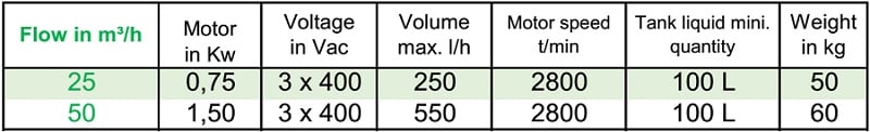 For maintaining machined parts under watering. The pump uses the coolant liquid for its own cooling and returns the excess liquid to the machine circuit (example). This robust and reliable assembly requires very little maintenance and creates a vacuum of up to 50 mbar.