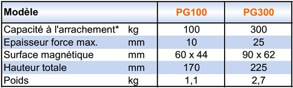 *Poids maximum pour pièces en acier S235JR avec surfaces en contact lisses et d’épaisseur suffisante. La capacité de levage varie en fonction du type de matière, de l’épaisseur de la pièce, de la taille et de la qualité de la surface en contact.